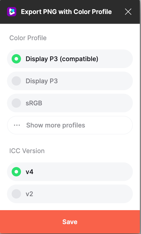 Figma > Plugin > Export PNG with Color Profile을 눌러서 내보내기 하면 Display P3 컬러를 사용할 수 있다.